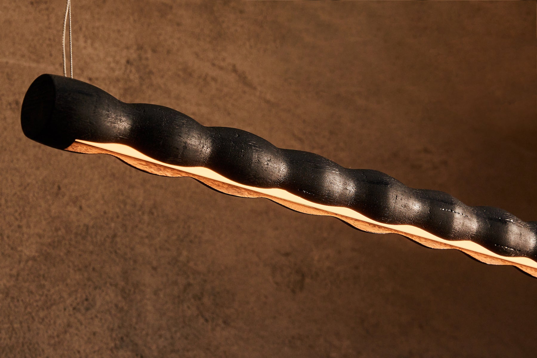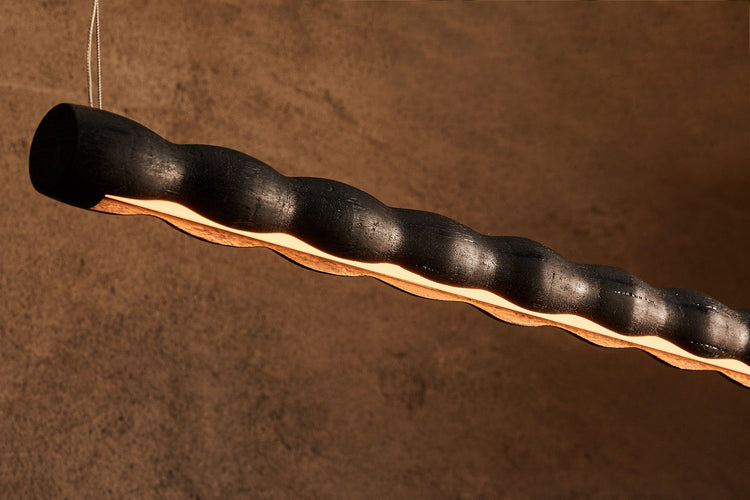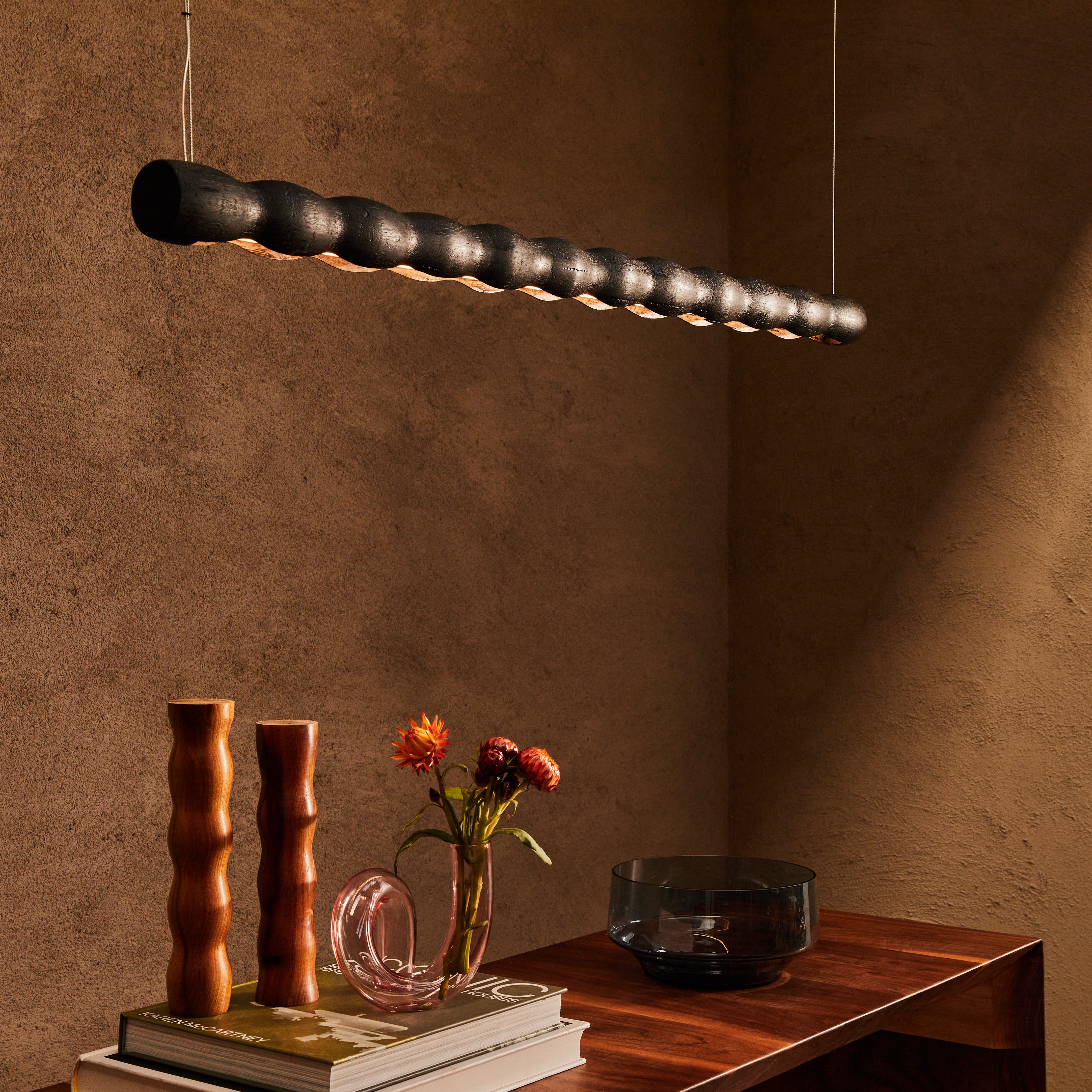 A modern and contemporary take on the sculptural curves and grooves of turned wood. This bobbin inspired pendant light adds texture to its surroundings.